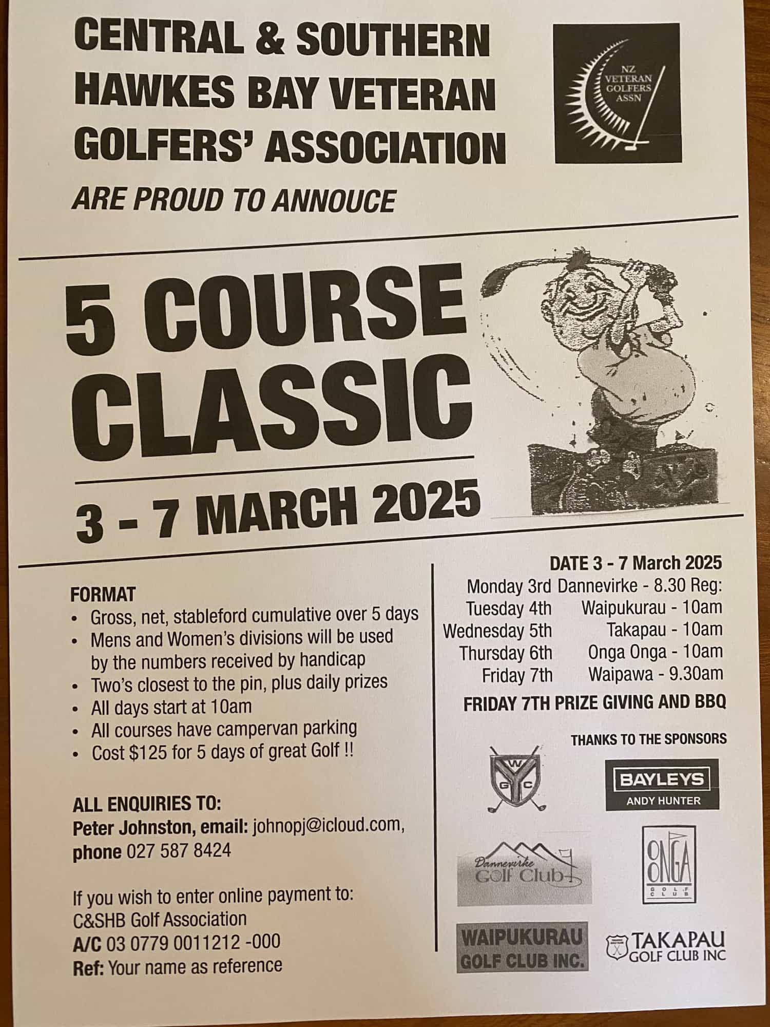 Central & Southern Hawkes Bay Veteran Golfer's Association are holding a 5 Course Classic 3-7 March 2025.
